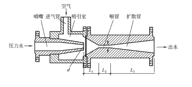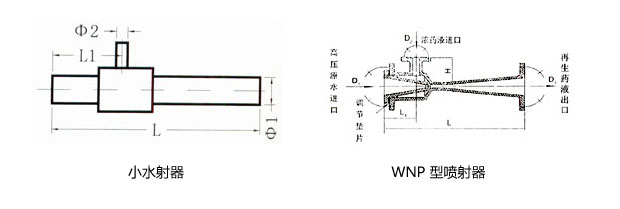 水射器原理 高壓原水通過管道閥門進(jìn)入噴射器的漸縮段,將靜壓頭轉(zhuǎn)換成動能,在噴嘴處成為高速射流,使混合室形成微真空狀態(tài),將高濃度的再生藥液吸入混合室,并使再生藥液的壓力和速度發(fā)生變化;在混合段內(nèi),水和藥液得到充分地混合,然后注經(jīng)擴散段,使再生液減低流速,靜壓頭升高,再通過出口管道及閥門將稀再生液送到交換器本體中。