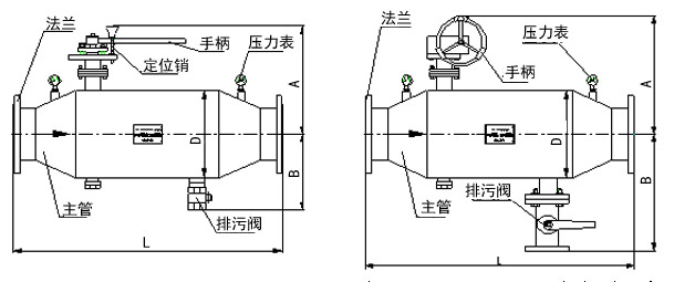 型號(hào) | 公稱通徑 | 最大流量 | L(mm) | A | B | D | 排污口 | 重量Kg | |||||