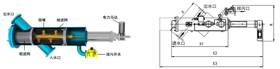 型號 | 管徑 | 出入水口 | X | X1 | X2 | X3 | K | 過濾面積 | 處理水量 | 重量 |