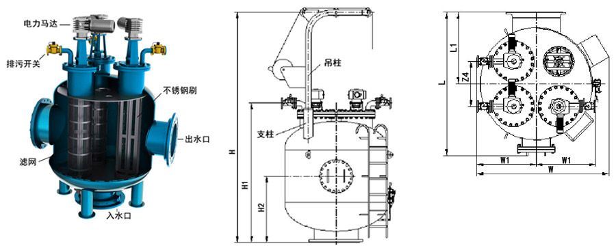 型號 | 管徑 | 出入水口 | L | L1 | W | W1 | H | H1 | H2 | Z4 | 流量 | 過濾面積 | 重量 |